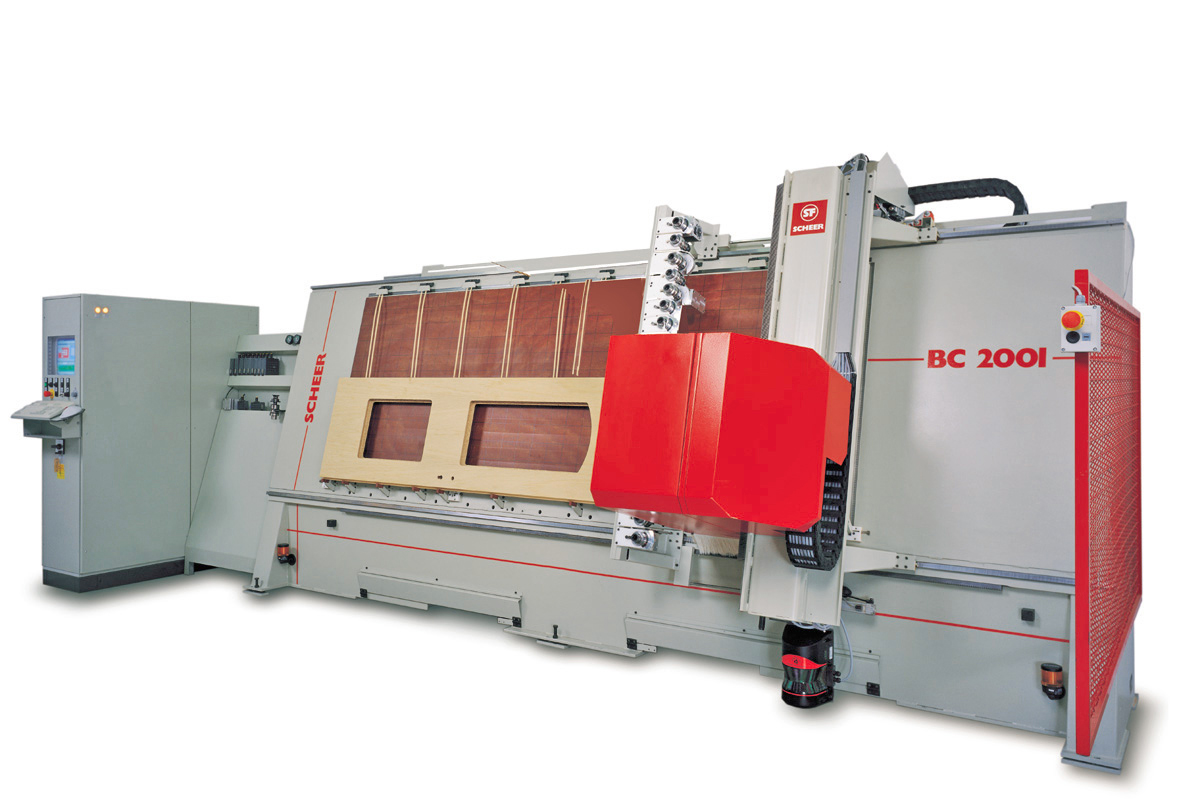 The development and construction of the Scheer drilling and routing centre stipulate important specifications, one of which is the spatial footprint of the machine, limiting it to a minimum without compromising easy access for operation and maintenance. The portal construction, known in mechanical engineering as the familiar portal construction (gantry and table design), was combined with an inclined workpiece support. The advantage of this type of construction is the easy and effortless transport of the workpieces to the machine. Further attention was paid to visual clarity of the workpiece support, which is equipped with a variety of clamps and stoppers. A further important point was to keep set-up times to a minimum. The close cooperation of construction, production and practicality resulted in the “upright” drilling and routing centre. All tasks, ranging from positioning of the workpiece, tool usage and machining operation, are easily and simply executed.